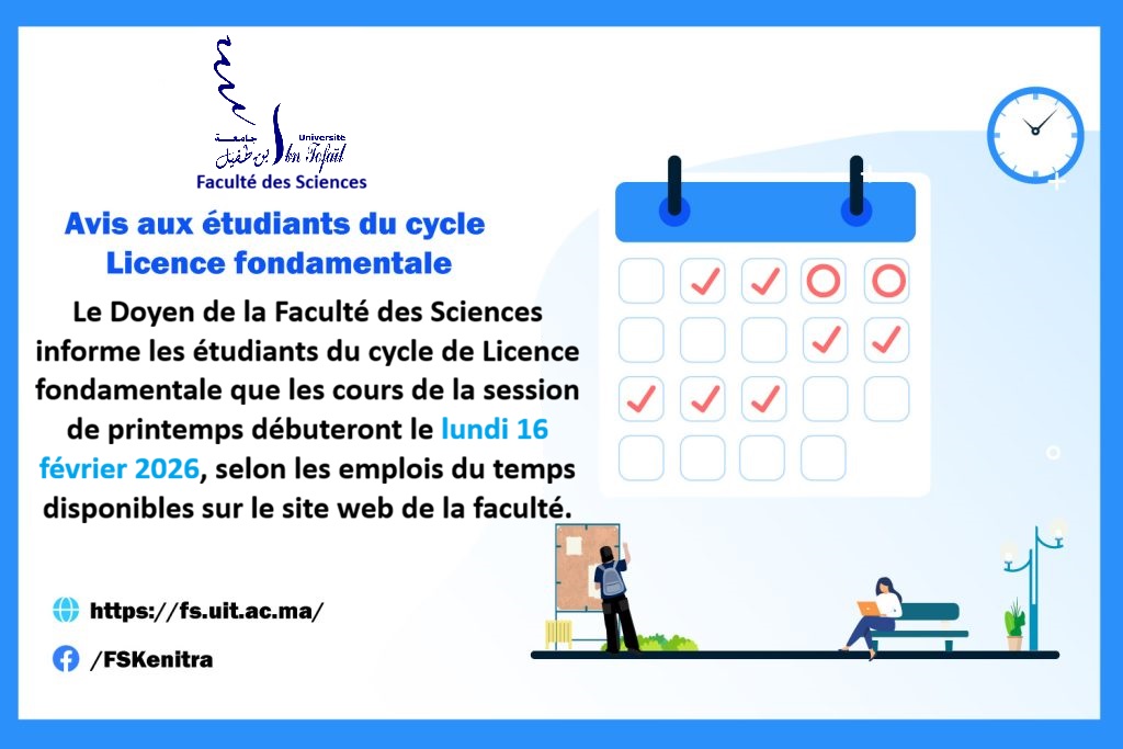 Le Doyen de la Faculté des Sciences informe les étudiants du cycle Licence fondamentale que les cours de la session du printemps débuteront à partir du lundi 16 février 2026, selon les emplois du temps:Emplois du temps pour les semestres 2Emplois du temps pour les semestres 4Emplois du temps pour les semestres 6