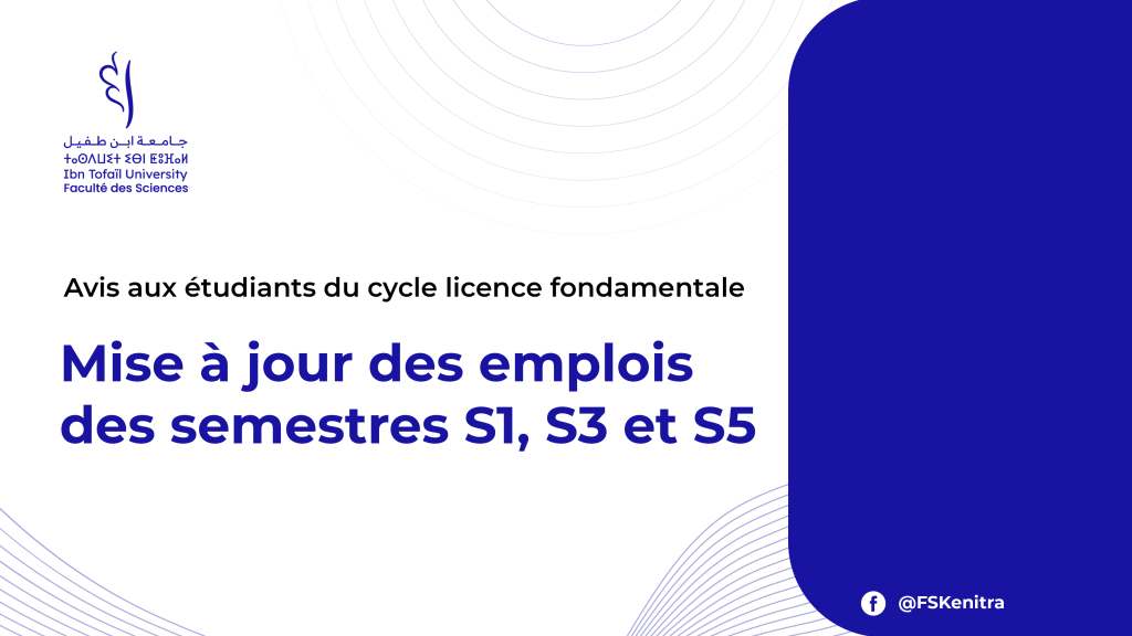 Il est porté à la connaissance des étudiants du cycle de licence fondamentale qu’une mise à jour des emplois du temps a été réalisée.Emplois du temps pour les semestres 1Emplois du temps pour les semestres 3Emplois du temps pour les semestres 5