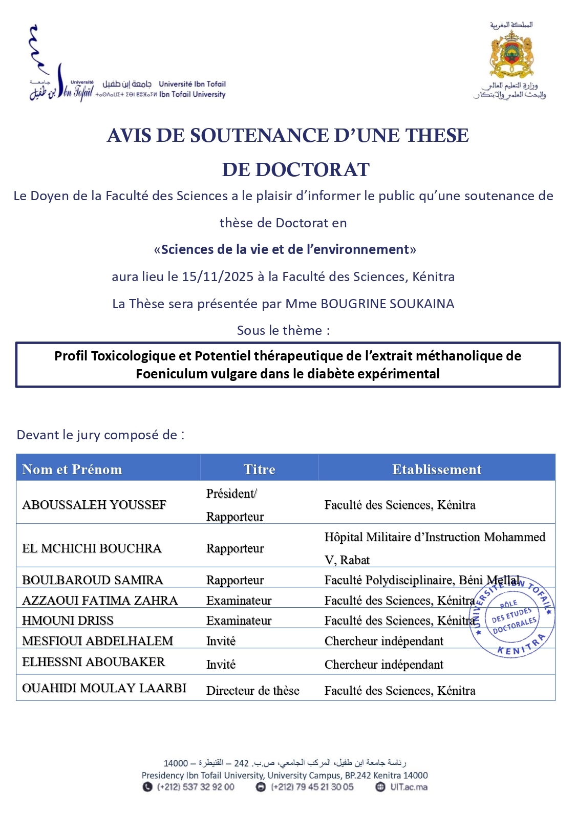 • Avis de soutenance de thèse de Mme BOUGRINE SOUKAINA