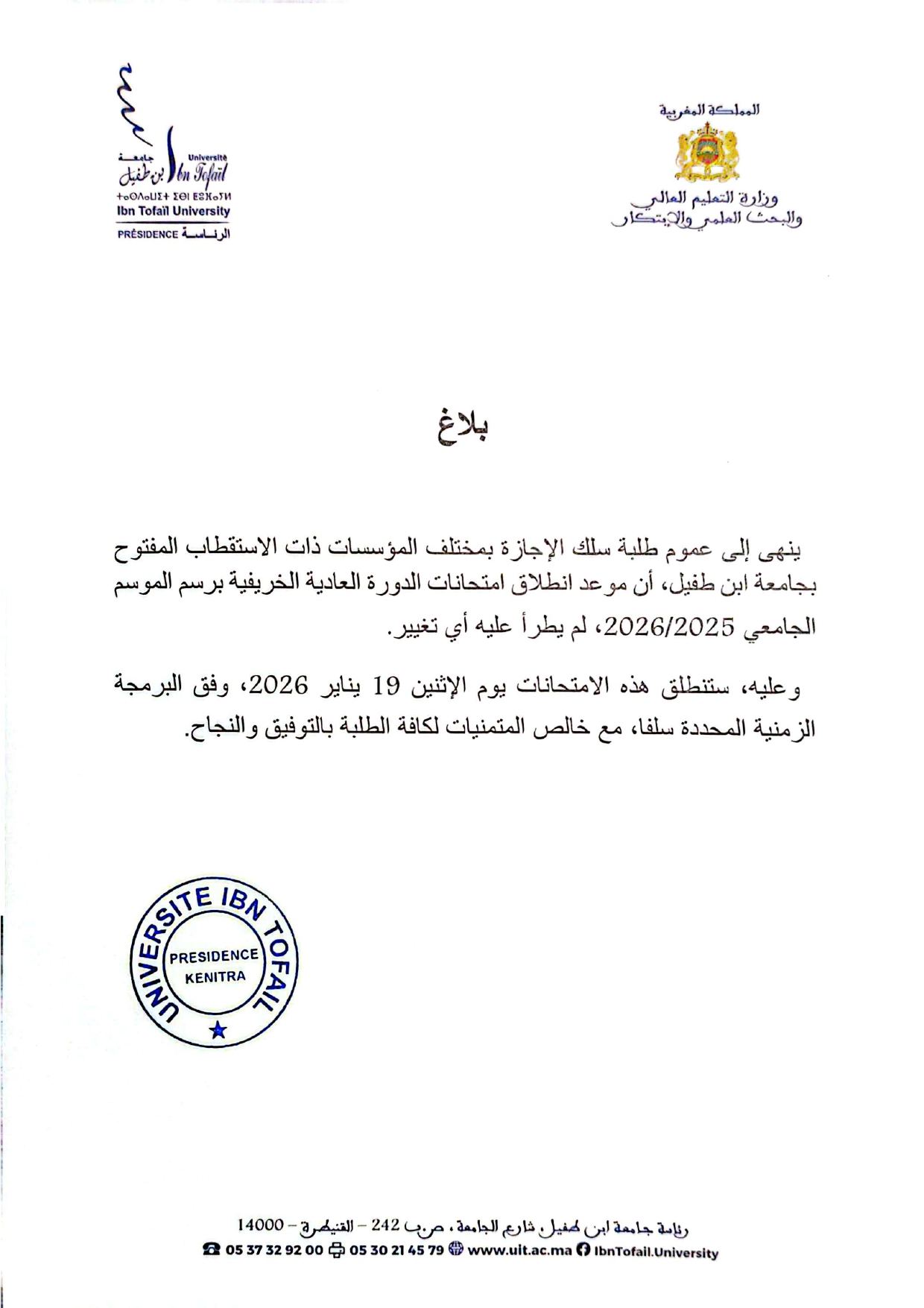 Communiqué officielL’Université Ibn Tofail informe l’ensemble des étudiantes et étudiants que les examens de la session d’automne de l’année universitaire 2025–2026 débuteront le lundi 19 janvier 2026, selon le calendrier prévu.Bonne chance à toutes et à tous.