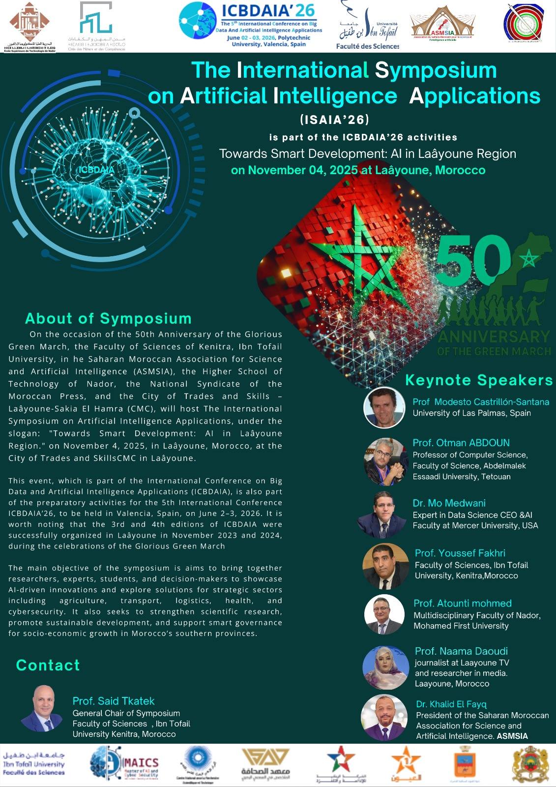 À l’occasion du 50ᵉ anniversaire de la Glorieuse Marche Vert, la Faculté des Sciences de Kénitra relevant de l’Université Ibn Tofaïl, en collaboration avec l’Association du Sahara Marocain pour la Science et l’Intelligence Artificielle (ASM-SIA), l’École Supérieure de Technologie de Nador, ainsi que la Cité des Métiers et des Compétences de Laâyoune–Sakia El Hamra (CMC), organise the International Symposium on Artificial Intelligence Applications, sous le theme: « Vers un développement intelligent : l’Intelligence Artificielle au cœur de la région de Laâyoune ».